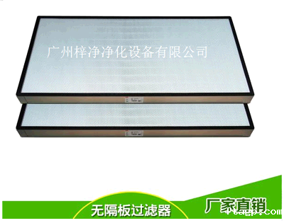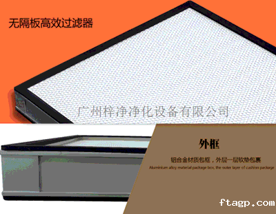 无隔板高效过滤器一般由防水阻燃的玻纤滤纸或PP高效滤料组成,在出风面一般都装有喷塑的六角菱形护网,用以保护玻纤滤纸不被破坏。因为无隔板高效过滤器的重量轻,小巧紧凑,使它容易被安装在开放式箱体,FFU层流罩和超净工作台内,无隔板过滤器外框为铝型材、不锈钢或镀锌板,用聚氨酯密封胶密封而成。