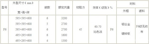 F6级袋式中效过滤器标准技术参数: