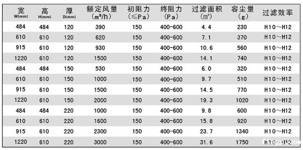 亚高效过滤器规格尺寸技术参数: