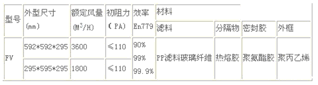 FV型亚高效过滤器(塑框)型号尺寸及其它技术参数: